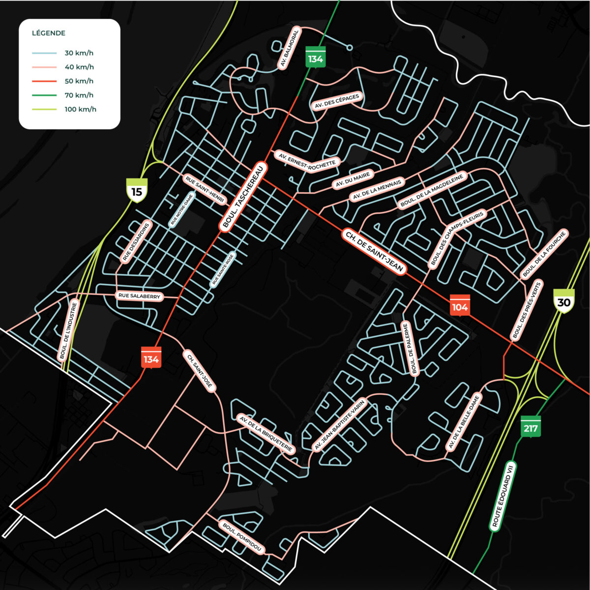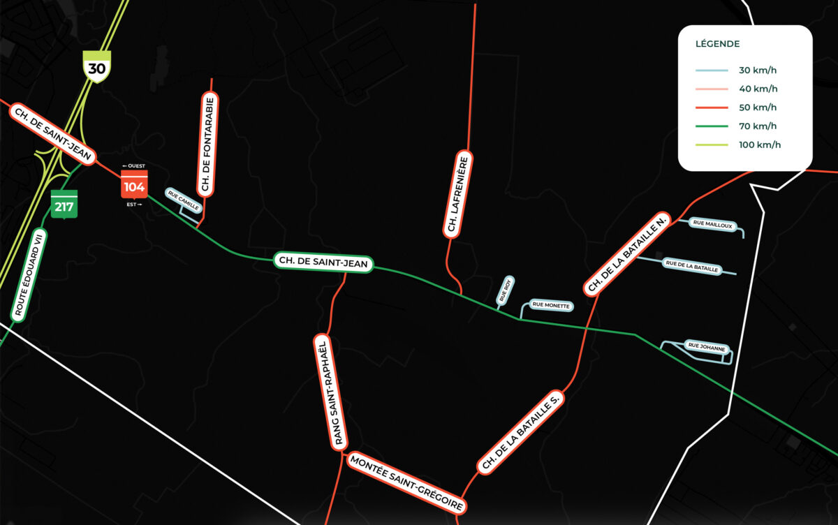 La limite de vitesse dans les zones scolaires et à proximité des parcs demeurera à 30 km/h. Sur les rues collectrices en zone urbaine, elle restera fixée à 40 km/h et, en zone rurale, à 50 km/h. Quant aux principales artères, le chemin de Saint-Jean et le boulevard Taschereau, la vitesse sera maintenue à 50 km/h.